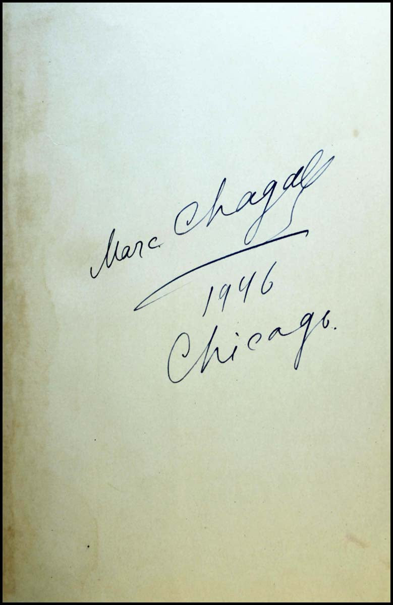 Translated by Norbert Guterman. Publisher's full blue cloth. Front board stamped in gilt with a design by Marc Chagall. Spine lettered in gilt. Binding a little grubby, some toning and yellowing to inner boards/joints. Jacket near fine with minimal traces of age and shelf wear. Signed and dated in blue ink on the front free endpage "Marc Chagall / 1946 / Chicago."