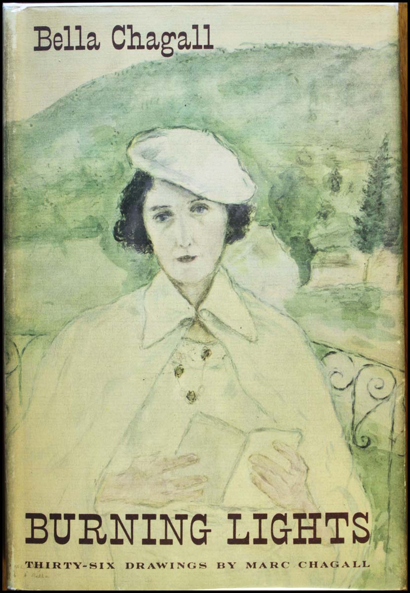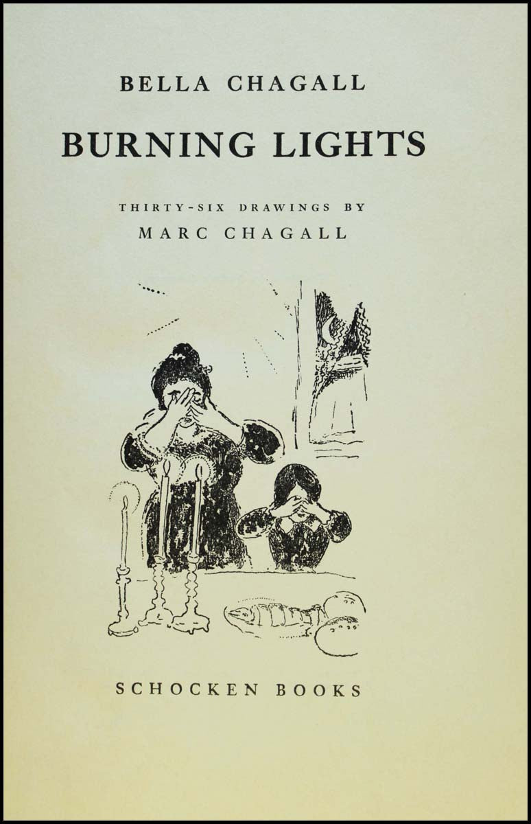 Chagall, Marc. (1887 - 1985) [Chagall, Bella. (1895 - 1944)]. Burning Lights: Thirty-six Drawings by Marc Chagall - SIGNED. New York: Schocken. 1946. First edition. Originally written in Yiddish in France in 1939 by Bella Rosenfeld Chagall, writer and wife of the artist Marc Chagall, the work was published posthumously in English in 1946. A recollection of Bella's childhood in a Russian-Jewish family, the work is further brought alive by the remarkable thirty-six drawings by her husband which accompany the stories. "They combine a moving tenderness for the Jew of that time in his every-day existence with an inspired rendition of the religious exaltation and ecstasy of which he was capable." (from the dj)