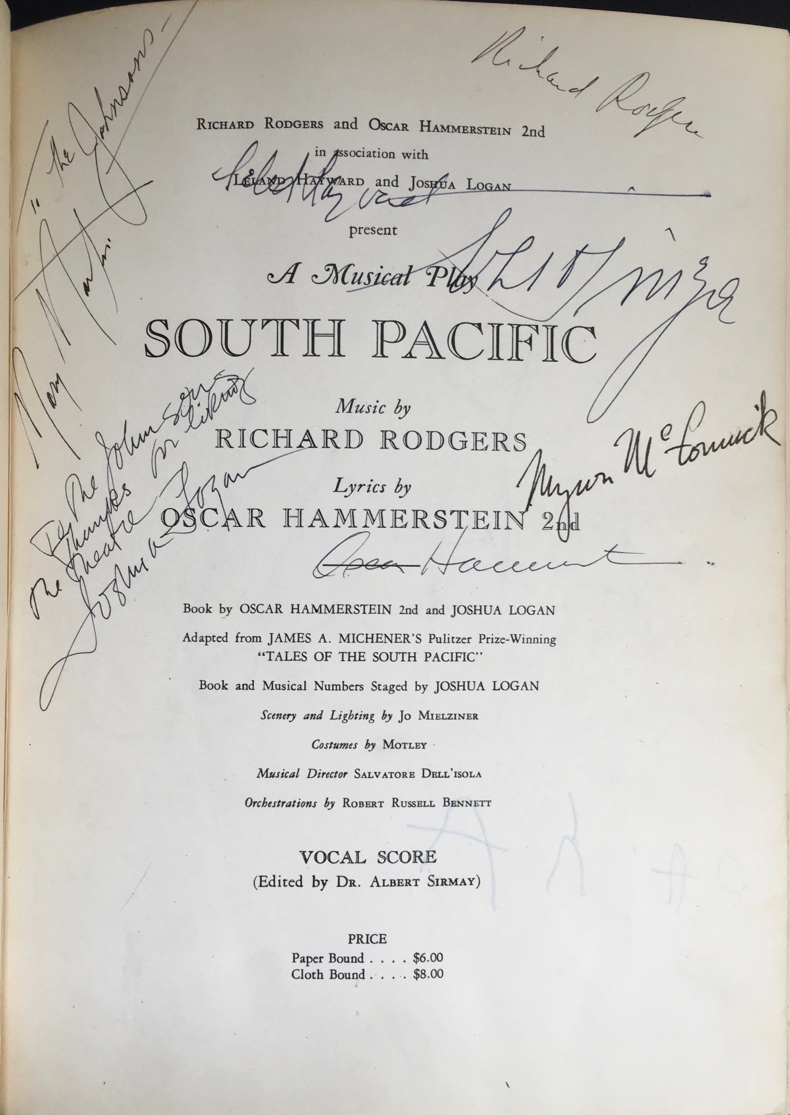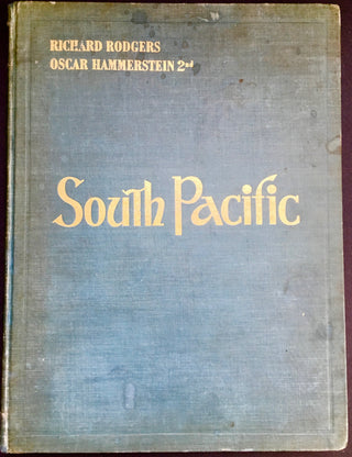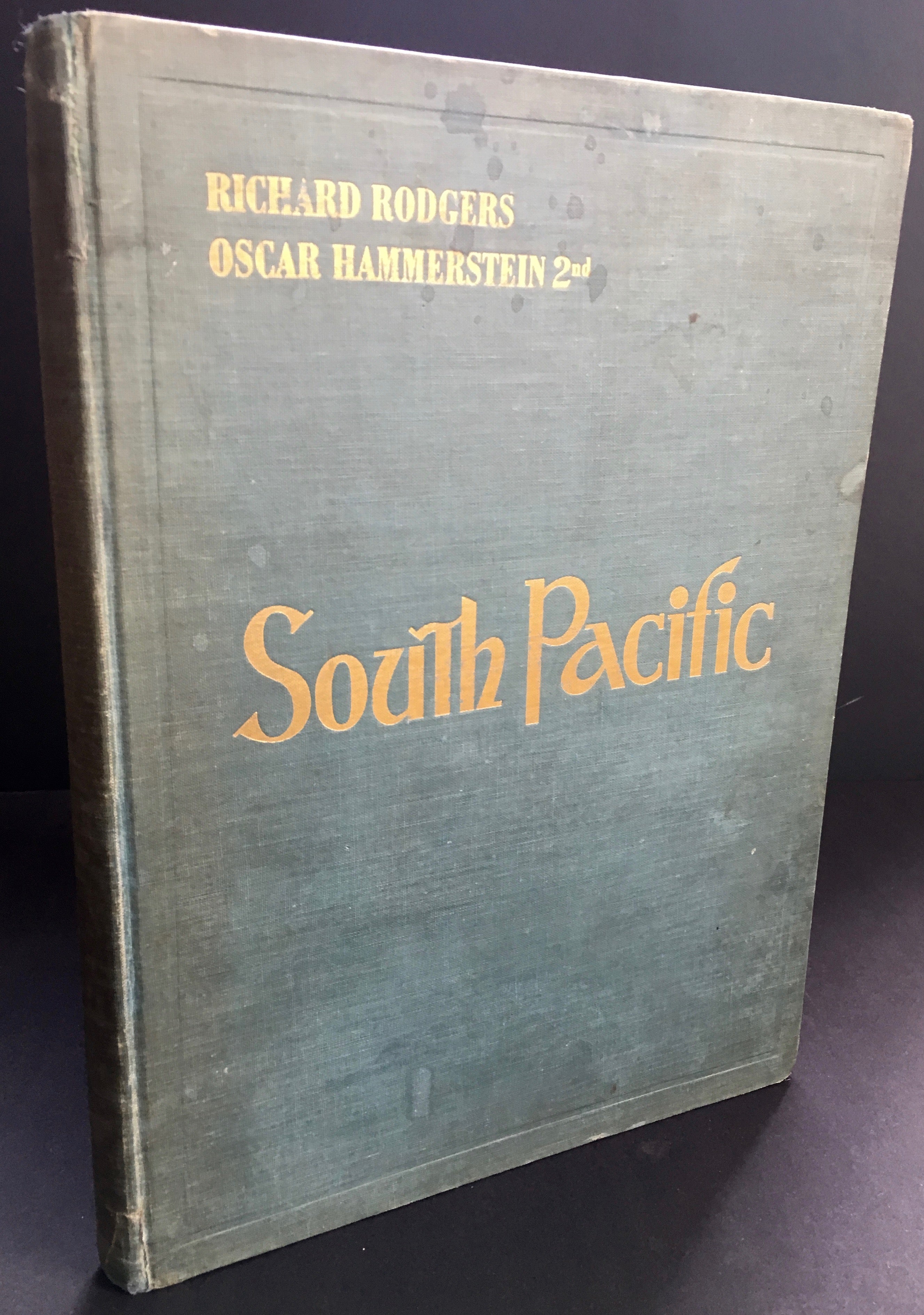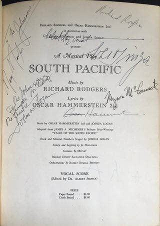 Rodgers, Richard. (1902-1979) & Hammerstein, Oscar. (1895-1960). South Pacific - Inscribed by Rodgers and Hammerstein, Mary Martin, Ezio Pinza, Joshua Logan, Leland Hayward and Myron McCormick. New York: Williamson Music, Inc. . 1949. First edition. 172 p., 31 cm. [PN] 757. First hardcover edition of the vocal score, inscribed by the lyricist and composer, director and producer and three of the principal stars in the original Majestic Theatre production of 1949. The title page boldly signed and inscribed, "To the Johnsons, Mary Martin" and additionally signed and/or inscribed by: Richard Rodgers, Oscar Hammerstein II, Joshua Logan, Leland Hayward, Ezio Pinza and Myron McCormick. Original full blue cloth, rebacked, toned and with significant areas of staining to boards; new endpapers; title page backed, with slight show-through from a now obscured child inscription on the verso; preliminaries and a few other pages with erased markings, else fine. Fuld p. 511.