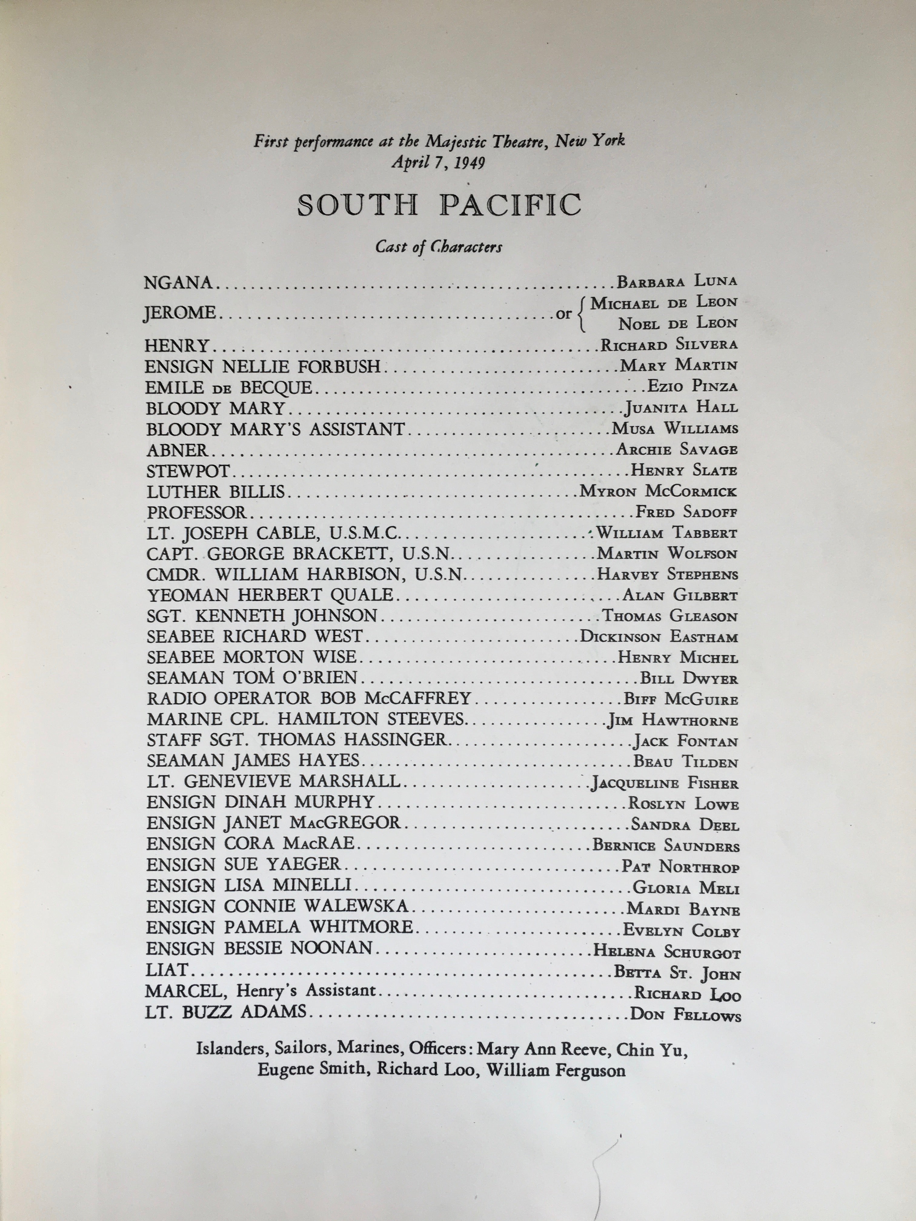 Rodgers & Hammerstein’s "South Pacific" first opened in NYC on April 7, 1949 and closed in 1954 after five years of extraordinary acclaim and countless awards including nine Tonys and a Pulitzer. This is historic copy, signed not only by the composer and lyricist, director and producer, but by Mary Martin, Tony Award winning star and creator of Nellie Forbush (also of Maria in The Sound of Music); Ezio Pinza, great Italian Basso who was creator of the role of Emile De Beque.; Myron McCormick, American actor who was the only cast member to remain with the show for all 1,925 performances, and who won a 1950 Tony Award for his portrayal of sailor Luther Billis.