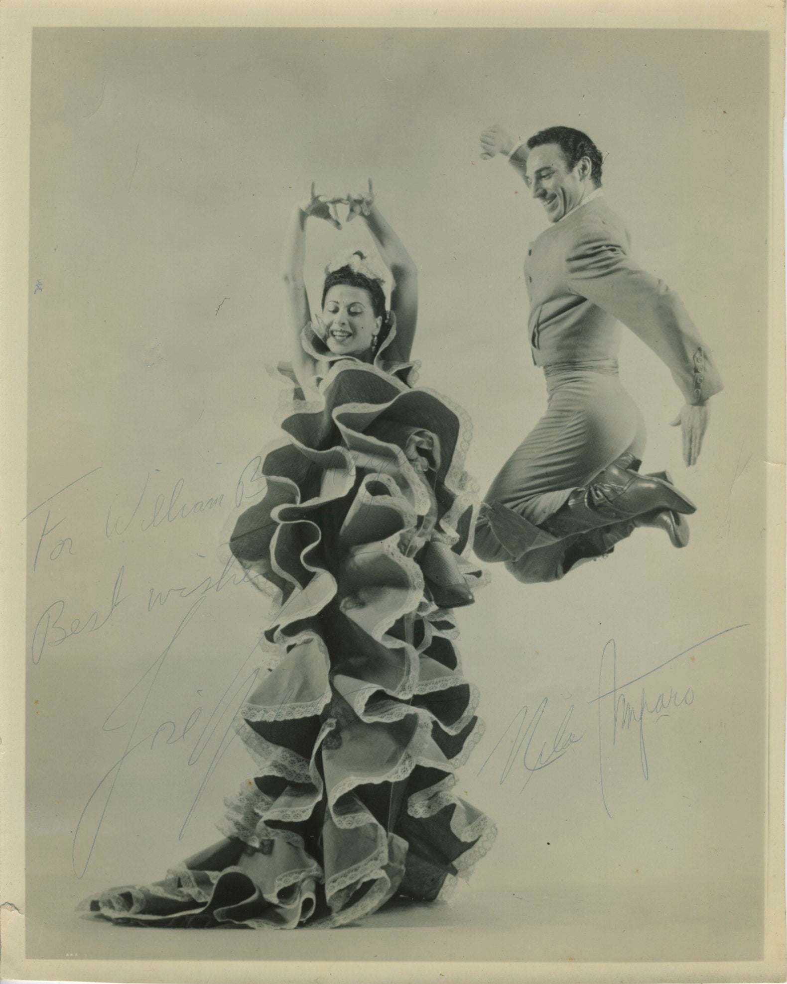 An ebullient 8 x 10 inch photograph of the flamenco dancer and choreographer in a mid-air flamenco pose, together with Nila Amparo. Both have signed in blue ink, a couple shades on the light side but fully visible and otherwise in In very fine condition.