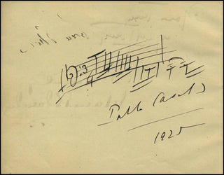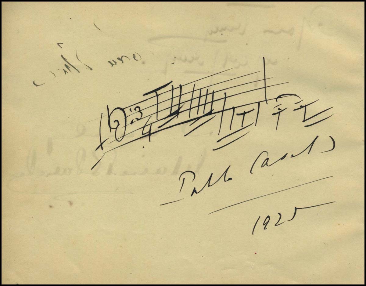 Boldly penned AMQS from the great Spanish composer, conductor, and cellist, one of the most influential musicians of the 20th century, also well known as a humanitarian. An Autograph Musical Quotation from the Prelude of the 3rd Bach Cello Suite, boldly penned and signed "Pablo Casals / 1925." 7.5 x 6 inches. Two unidentified signatures on the verso showing through slightly, otherwise fine.