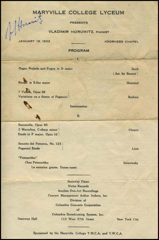 Horowitz, Vladimir. (1903-1989). Signed Program. Signed 1932 Maryville College Lyceum single sheet recital program from the beloved and legendary pianist, signed in blue ink on the upper left corner. A few stains and two heavy creases.