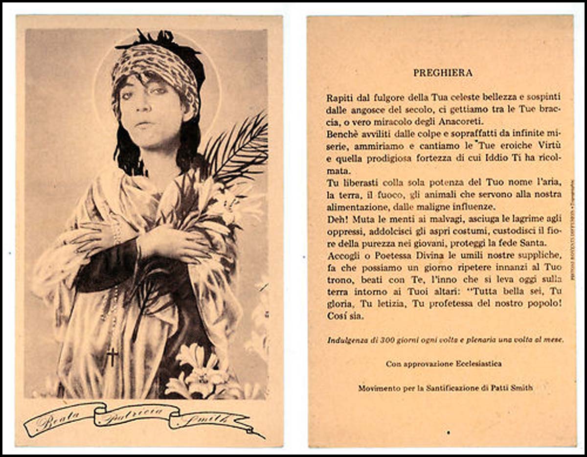Late 1970's or early 1980's Italian prayer card with an image of Smith decked out as a Saint, with an amusing "preghiera" on the verso as with those cards made and distributed by the Vatican. This one apparently obtained at one of Smith's first Italian performances, in Bologna. 10.2 x 16.3 cm.
