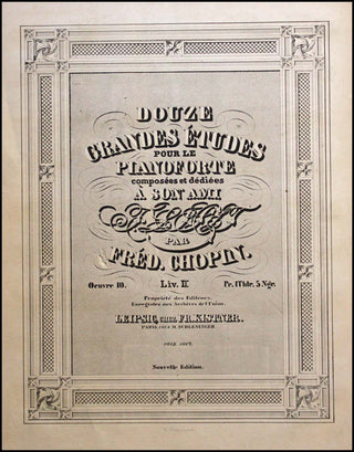 [Liszt, Franz. (1811–1886)] Chopin, Frédéric. (1810–1849)]. Douze Grandes Études pour le Pianoforte composées et dédiées à son ami F. Liszt. Oeuvre 10. Liv. II. . Leipzig: Fr. Kistner. [ca. 1850]. Nouvelle Edition. Upright folio. 27 pp. Engraved. [PN] 1019. Edges heavily chipped with small losses within the plate on the final page, spine reinforced with tape.