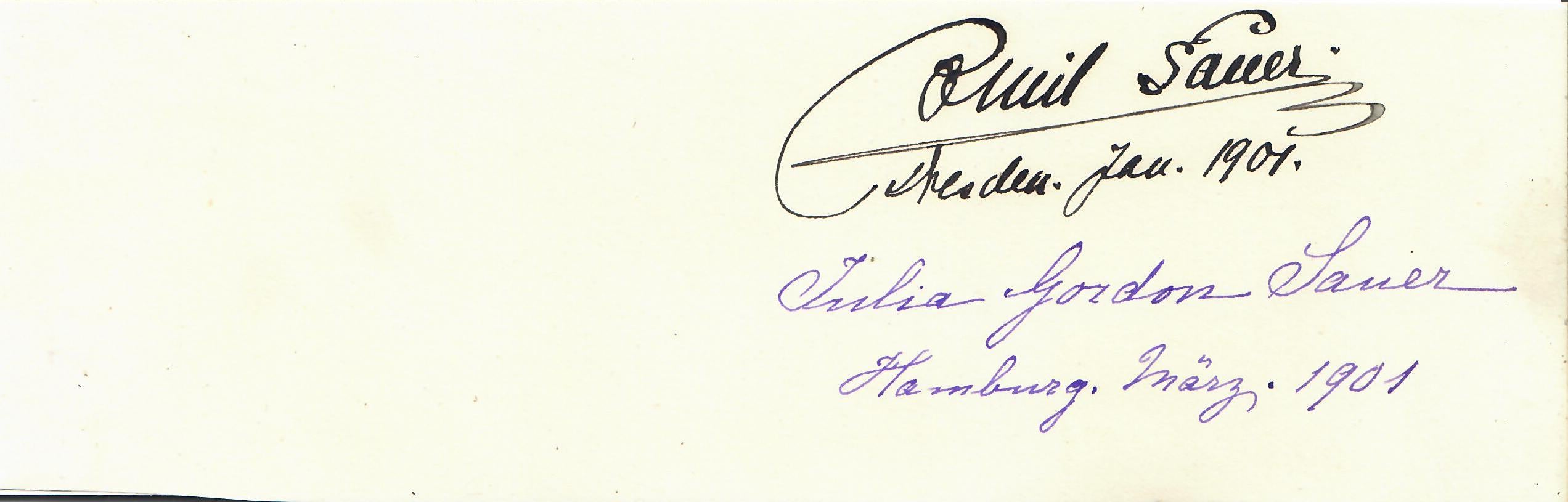 Bold autograph signature from the great pupil of Liszt. On a clipped page dated Dresden, Jan. 1901. The page also signed by Sauer's mother, herself an accomplished pianist and Emil's first piano teacher, Julia Gordon Sauer, 'Hamburg, March, 1901'. 8.5 x 2.75 inches (22 x 7 cm.).