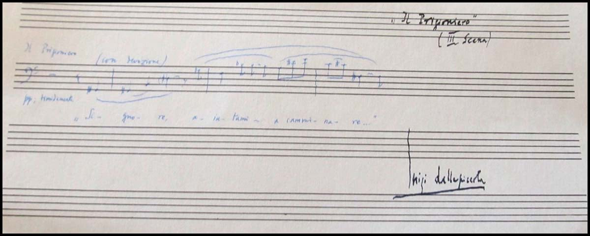Dallapiccola, Luigi. (1904–1975). Autograph Musical Quotation, "Il Prigioniero." . An unusual AMQS from the great Italian composer and pianist, who has neatly penned 4 measures from the "III Scena" of his "Il Prigioniero." The quotation in blue ink, the signature and identification in black ink. 3.5 x 9 inches and in very fine condition.