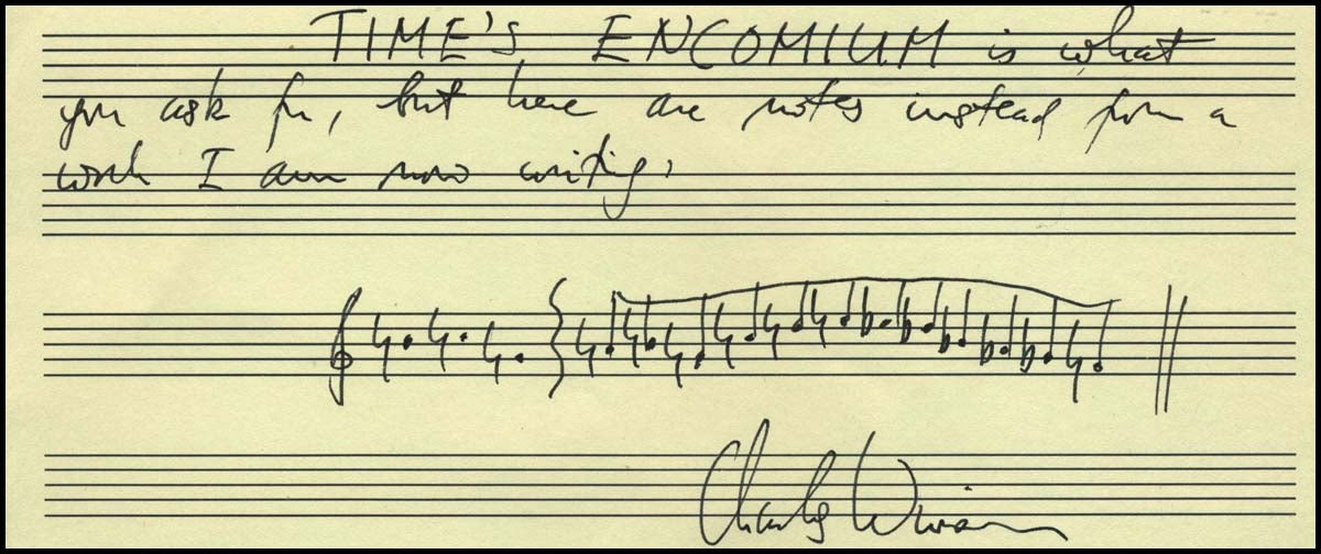 Wuorinen, Charles. (b. 1938). Autograph Musical Quotation. Signed detailed AMQS from an unidentified work which the composer has written on a manuscript page measuring 3.5 x 8.75 inches. "TIME'S ENCOMIUM is what you ask for, but here are notes instead from a work I am now writing...Charles Wuorinen." Fine.