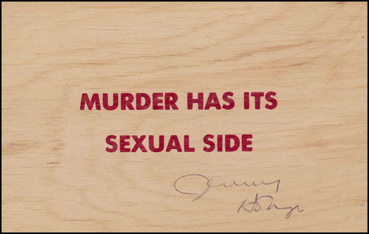 [Literature & Art] Holzer, Jenny. (b. 1950). Signed Wooden Card. Wooden card printed in red with one of the American conceptual artist's 'Truisms': "MURDER HAS ITS SEXUAL SIDE," signed lower right by Holzer and in fine condition.