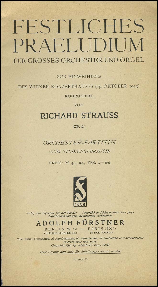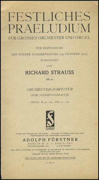 Strauss, Richard. (1864–1949). FESTLICHES PRÄLUDIUM FÜR GROSSES ORCHESTER UND ORGEL zur Einweihung des Wiener Konzerthauses am 19. Oktober 1913...Orchester-Partitur (zum Studiengebrauch). Berlin: Adolph Furstner. 1913. First edition. Miniature full score. 14 cm x 24.5 cm. 75 pp. [PN] 7004.