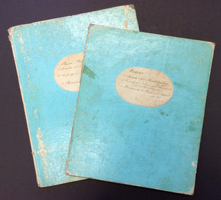 Turquoise boards and spine, heavily rubbed and with significant edge and corner wear; contemporary manuscript labels on the covers soiled and partially detached but intact; overall foxing and toning to the internal pages. Binding completely intact and structurally sound; overall still complete and usable copies in very good condition. 10 x 12 inches (25.7 x 30.7 cm) and 10.25 x 13 inches (26 x 33 cm).
