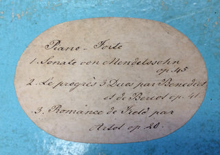 Small sammelband in two volumes (scores and violin parts) of a selection of Romantic pieces arranged for violin and piano. Included are: Mendelssohn's cello sonata no. 1, arranged by Ferdinand David; three duos on themes by Labarre, Schubert, and Donizetti, arranged by Charles de Bériot and Julius Benedict; and John Field's Nocture no. 5, arranged by violinist Alexandre Joseph Artôt as a "Romance." Complete works as follows: