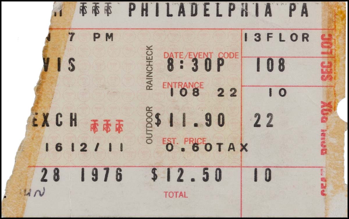 [Jazz & Song] Presley, Elvis. (1935-1977). "Love Me Tender" - Signed Sheet Music. Four integral pages, 9" x 12", n. p., n. d. The legendary vocalist has placed his signature below a vignette portrait of himself on the front cover of sheet music for one his most famous songs, "Love Me Tender," which he wrote with Vera Matson and recorded in 1956. Edges are lightly toned. With a 3.25" x 2" ticket stub to a 1976 Philadelphia concert where the signature was apparently obtained.