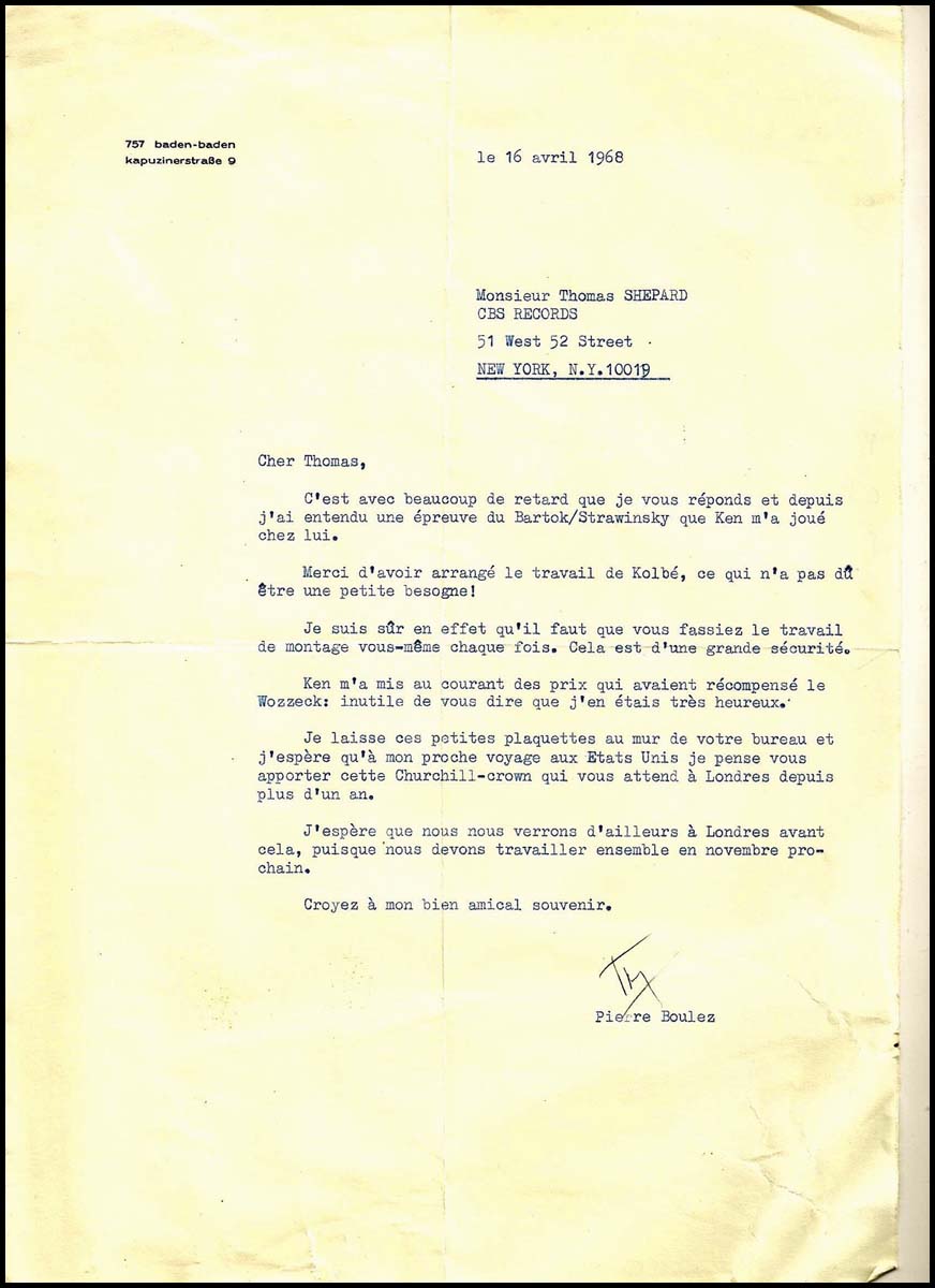 Boulez, Pierre. (1925–2016). Signed Letter to his record producer. Interesting typed letter signed from the important French composer and conductor. 1 page, 16 April, 1968, to his recording producer, Thomas Z. Shepard. Apologizing for his delayed reply, but noting that he has listened to the edited and mixed test pressing of his recent Bartok/Stravinsky recording made with the BBC Orchestra. He goes on to thank TZS for fixing the first edit and mix as performed by another producer and that he wants TZS to do all the editing and mixing personally from hereon. He mentions awards given for Wozzeck, his first recording for CBS, also the first collaboration of Boulez and Shepard, and the plaques on Shepard's office wall. He is very happy with the Wozzeck awards, tells Shepard that there is a Churchill Crown waiting for him when he next goes to London, and then makes reference to their upcoming November recording sessions.