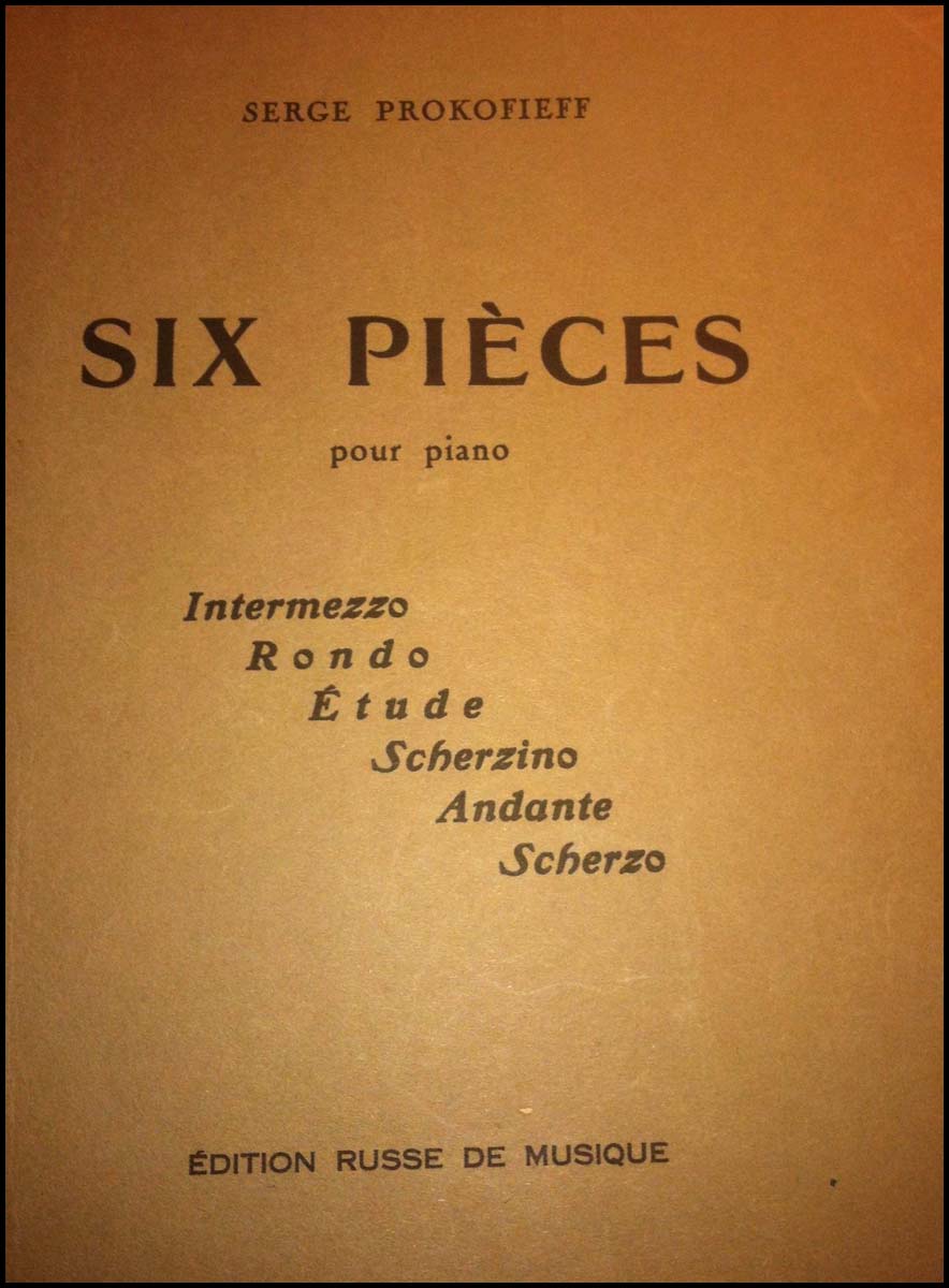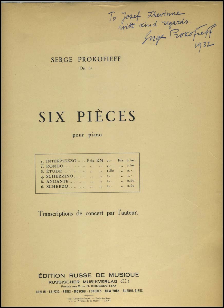 Prokofieff [Prokofiev], Serge. (1891-1953) [Lhevinne, Josef. (1874 - 1944)]. Six Pièces pour piano. INSCRIBED TO JOSEF LHEVINNE.. Berlin, Moscou etc.: Édition russe de musique. 1931. First edition. Complete set of the separately issued parts for each of the Opus 52 "Six Pièces pour piano," numbered 1-6 as Intermezzo, Rondo, Etude, Scherzino, Andante, and Scherzo. No price indications (indicating first issues), mostly disbound (the signature page in a protective plastic sheet), lacking outer wrappers for 2,3, and 5, all but one stamped "Hommage de L'Editeur" at the head of the title page, and the Intermezzo inscribed in blue ink at the top "To Josef Lhevinne / with kind regards. / Serge Prokofieff / 1932."