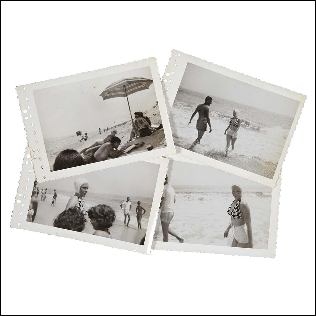 Group of four original snapshot photographs of Marilyn Monroe on the beach, apparently on Fire Island, 1950s. 3 1/4 x 4 3/4 inches (85 x 120 mm). Some handling creases. The set includes one image of Monroe lounging under an umbrella and three images of Monroe in a bathing cap at the shoreline. Unpublished and likely unique images.