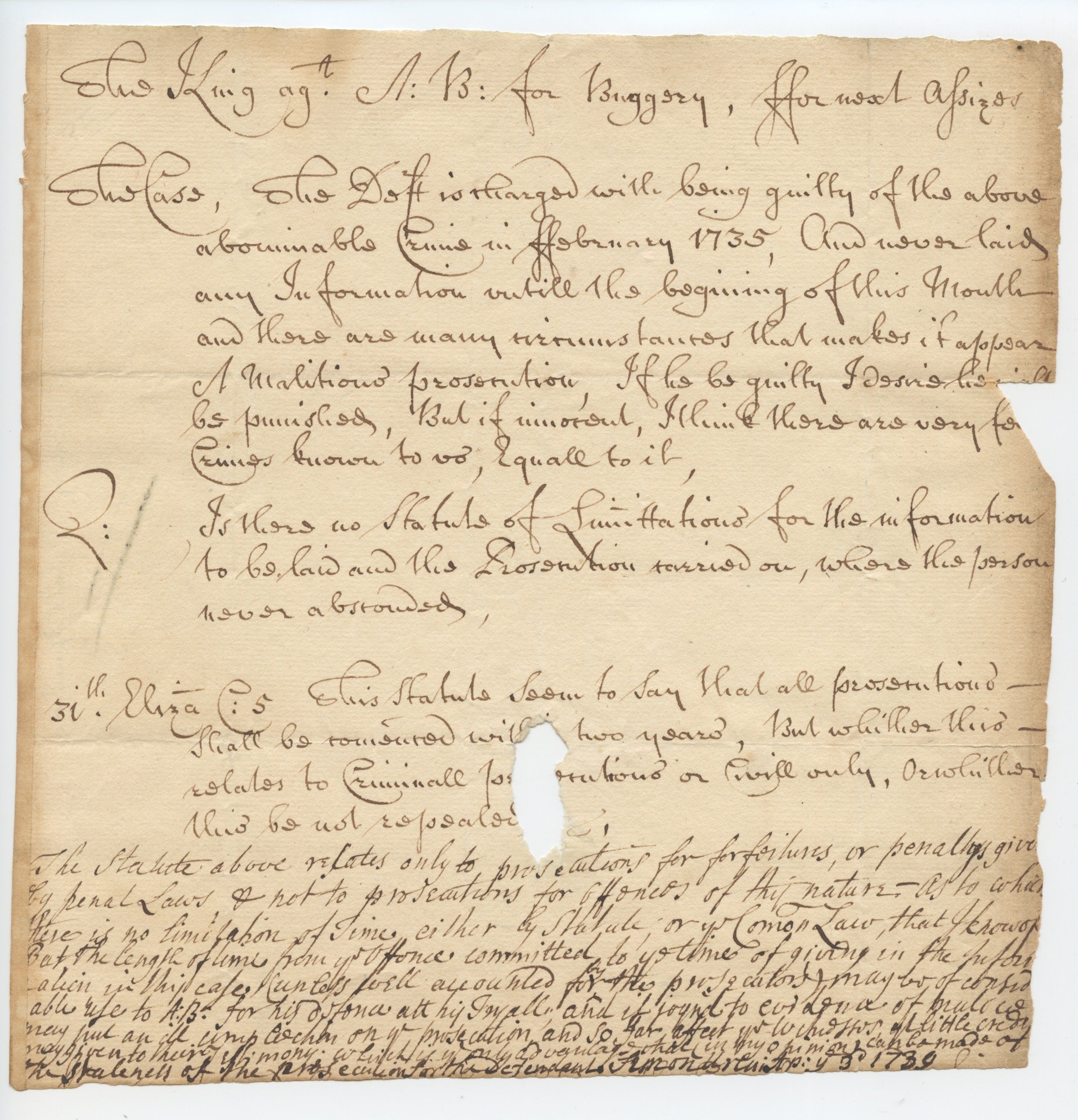 The Case, the defendant is charged with being guilty of the above abominable crime in February 1735, and never laid any information until the beginning of this month and there are many circumstances that makes [sic] it appear a malicious prosecution. If he be guilty I desire he might be punished, but if innocent, I think there are very few rimes known to be equal to it.
