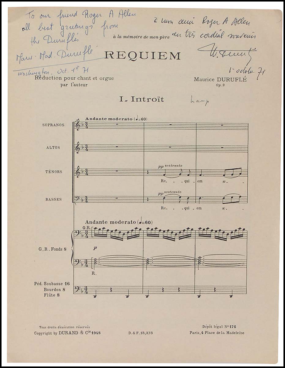 Duruflé, Maurice. (1902 - 1986). Requiem - SIGNED PRESENTATION COPY. Paris: Durand. 1948. First edition. Softcover, 9.5 x 12.25, 80 pages. Signed and inscribed on the first page in French in ballpoint by Durufle and his wife, and dated October 1, 1971. Overall toning, a couple small tears to the spine, and ownership notations to cover and title page, otherwise fine condition.