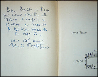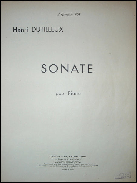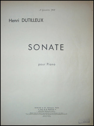 Dutilleux, Henri. (1916-2013). Sonate pour Piano, SIGNED Presentation Copy. Paris: Durand & Cie. . [1949]. First edition. Folio. 1f., 55 pp. [PN] 13402. Original wrappers, a very good copy. With a signed presentation inscription to "Paulette and Pierre who surely welcomed this sonata, the performer and the author during the very first long ago evening of 21 May [19]50..."