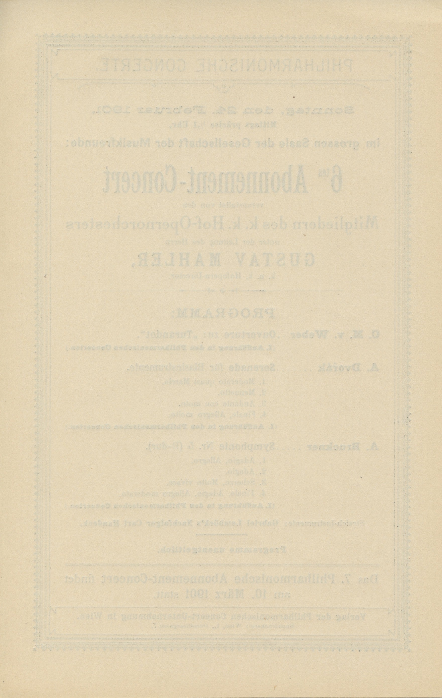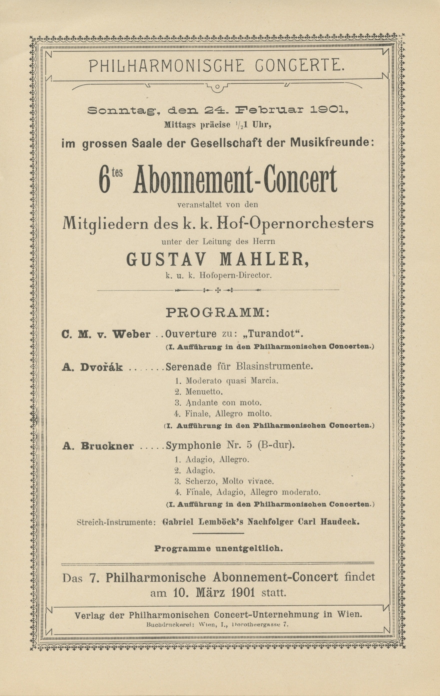 Scarce and unusual Vienna concert program, single sheet flyer,  February 24, 1901. Gustav Mahler conducting the Vienna Philharmonic Orchestra with C.M. v. Weber 's "Turandot Ouverture," Dvorak's little masterpiece "Serenade" Opus 44 for wind instruments (First Viennese performance), and Bruckner's Symphony V (First Viennese performance). In very fine condition. Original programs from Mahler's illustrious Viennese tenure are quite scarce, this being a particularly fine example. 6 x 9.5 inches; 15 x 24 cm.