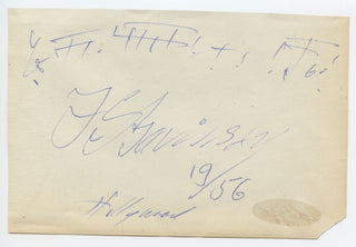 Superb AMQS of two instantly identifiable measures from "Petrouchka" boldly accomplished in blue ink, signed "I.Strawinsky" and dated "I-9/56 / Hollywood" on an off-white album page measuring 6 x 4.4 inches (15.2 x 11.2 cm). In fine condition, with mounting remnants to verso, and a small stain and loss to lower right corner, well apart from the writing.